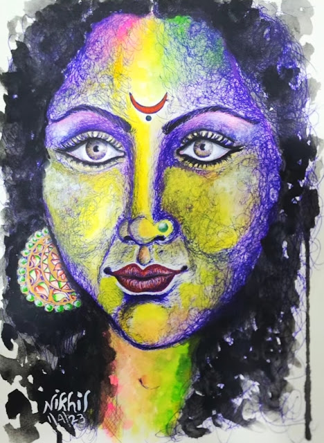 "She’s emerging from darkness (fading dark colours), cris-cross and curvy lines are obstacles but her eyes and forehead are full of hopes. Try a title that brings out this" Says Rajesh Lokanathan